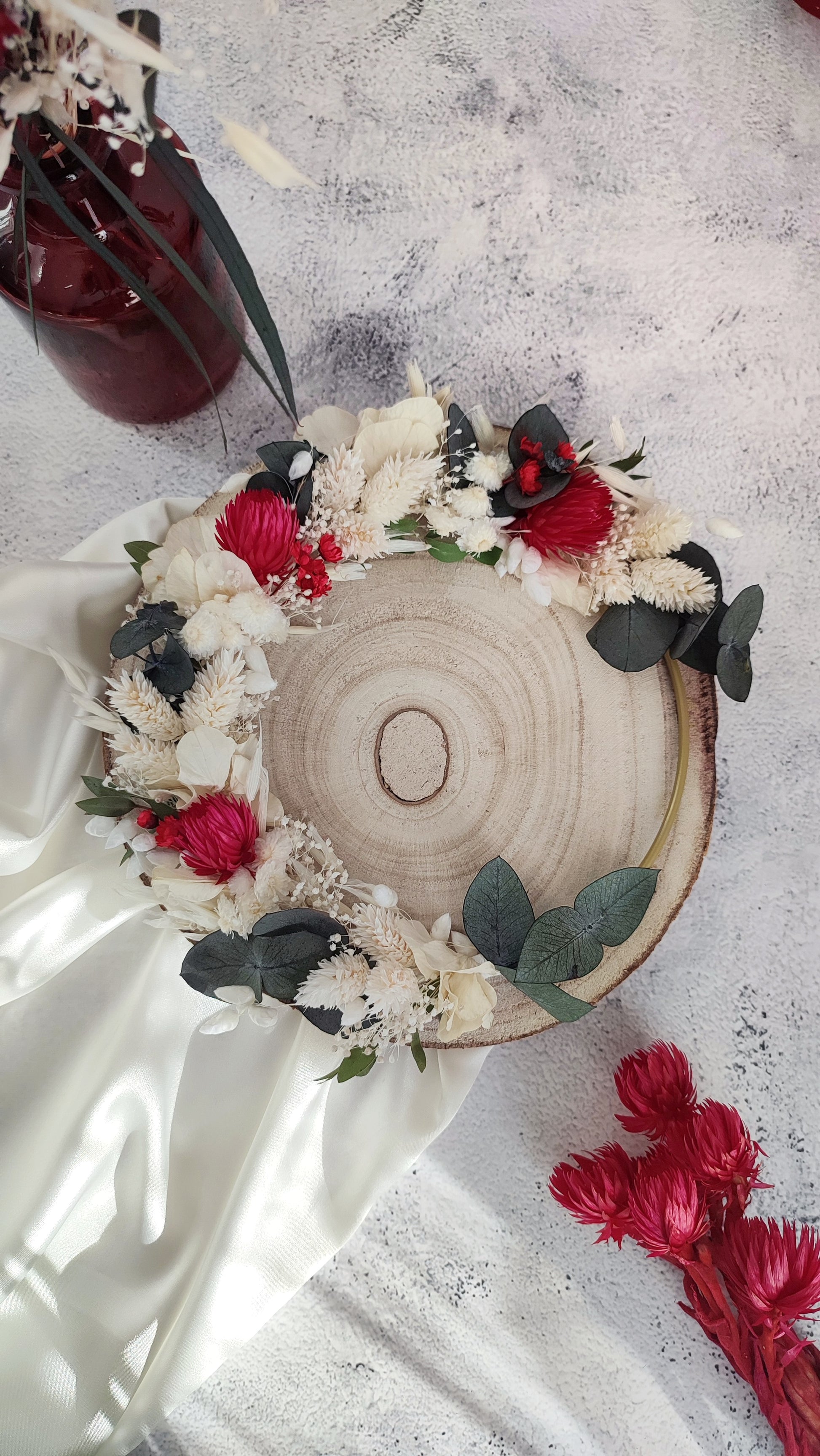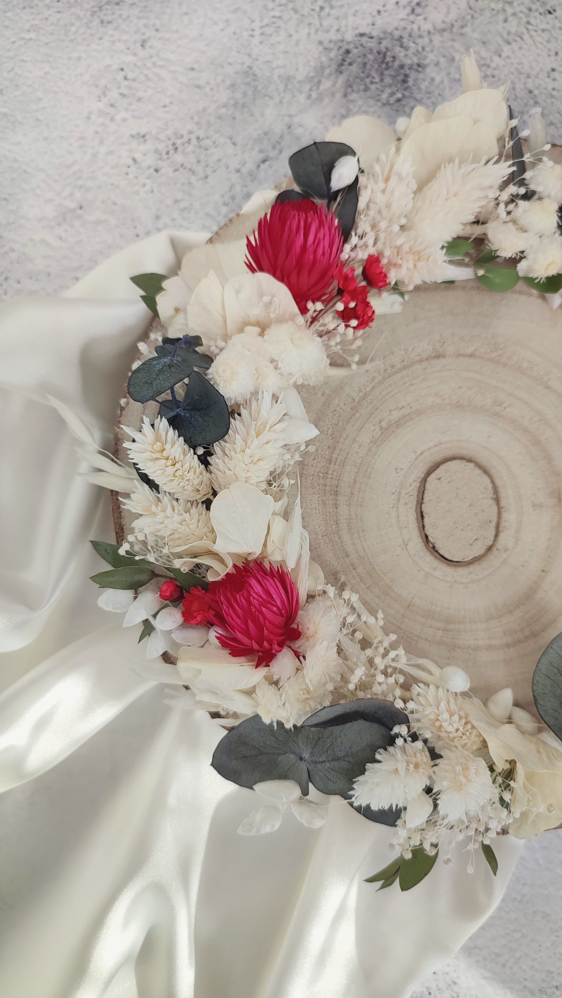 Ajoutez une touche élégante et romantique à votre décoration intérieure avec notre couronne murale Livia. Fabriquée avec des capblumen rouges, de l'eucalyptus, des immortelles et des hortensias, cette couronne spéciale Saint-Valentin apportera une touche chaleureuse et festive à votre maison!